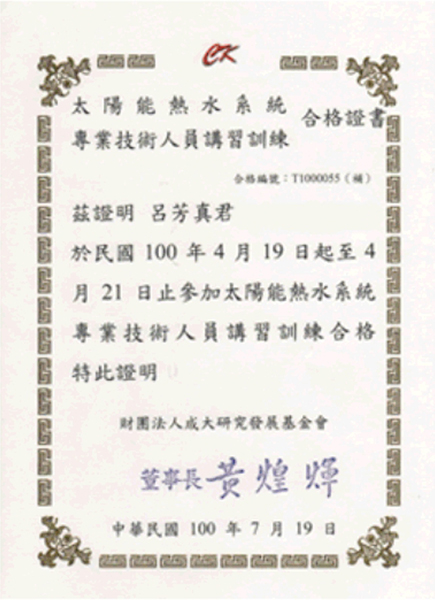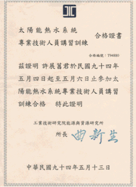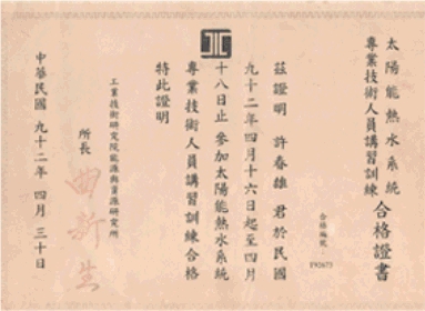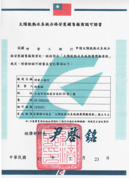 97年太陽能熱水系統合格安裝銷售廠商認可證書
