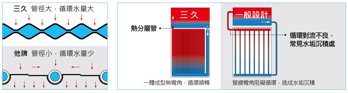 ● 耐腐蝕、水垢不易附著集熱效果佳。 ● 26道菱形集熱水路,集熱板水量是管式的2.5倍以上,集熱速度快、效率高。 ● 全國唯一生產高效率板式集熱板,集熱板上吸收太陽熱能直接加熱集熱板下的冷水,傳熱路徑最短最快,集熱效率最高。