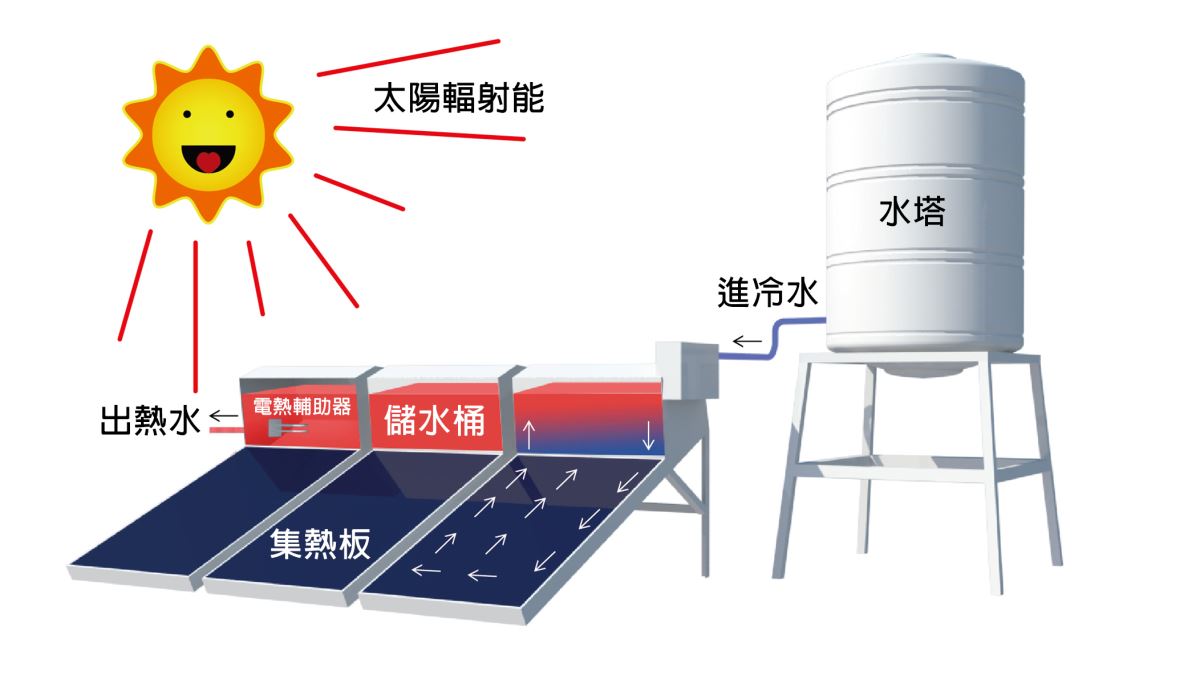 集熱板中的冷水吸收熱後,密度變小、重量變輕,自然上升至儲水桶;儲水桶底部的冷水,密度較大、重量較重,自然下降至集熱板再吸熱,如此反覆自然循環加熱,稱為「自然循環式」。