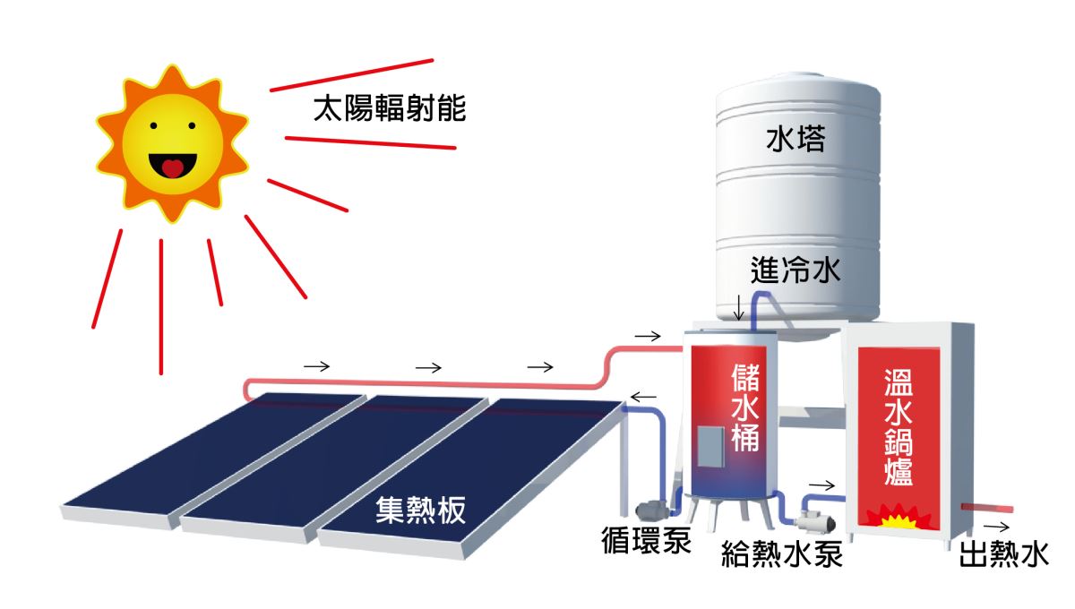 當集熱板水溫比儲水桶水溫高3℃以上時,以幫浦強制將儲水桶冷水打到集熱板再吸熱;吸熱後再回儲水桶,如此強制循環加熱,稱為「強制循環式」。