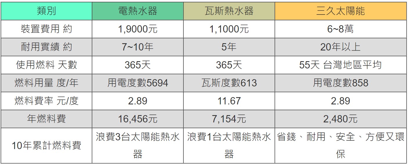 註1. 電價依民國112.4.1的費率,天然瓦斯依民國110.6.1中部地區費率,以台灣地區平均每戶每天使用300公升熱水,一年使用365天計算。